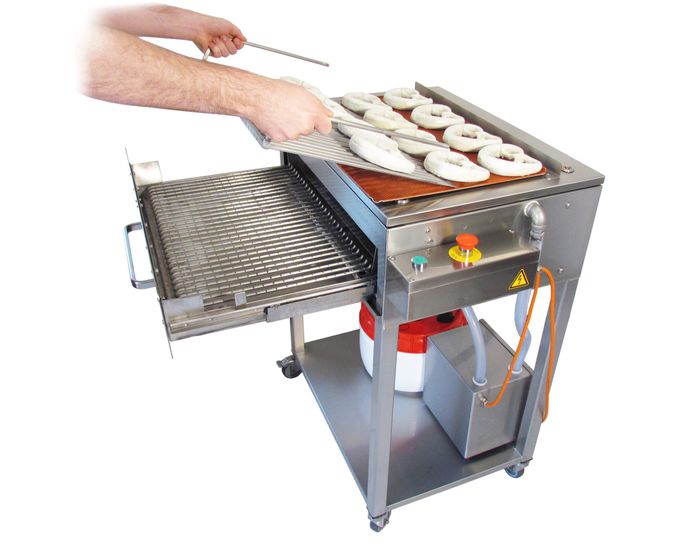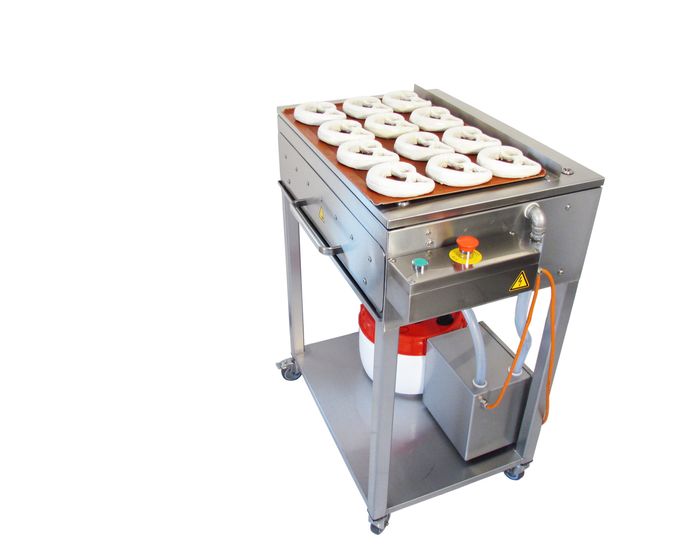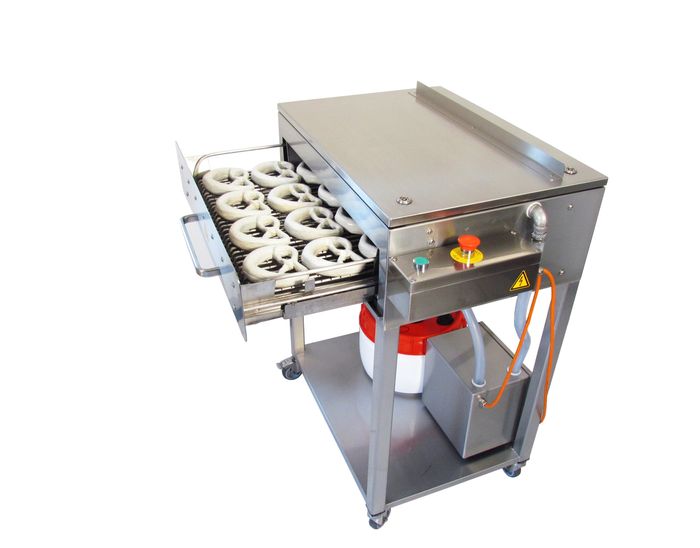 Der Laugenwechsel in der Filiale entfällt daher. Teigschlammreste lagern sich am Boden des Wechselbehälters ab. Das Belaugungsgerät spült sich bei jedem Belaugungsvorgang selbst. Mit diesem Gerät können alle Arten von Laugengebäck, z.B. Brezeln, Laugenbrötchen, Laugencroissants, belaugt werden. Der geringe Platzbedarf und die absolut gekapselte Bauweise erlauben ein sicheres und sauberes Arbeiten.